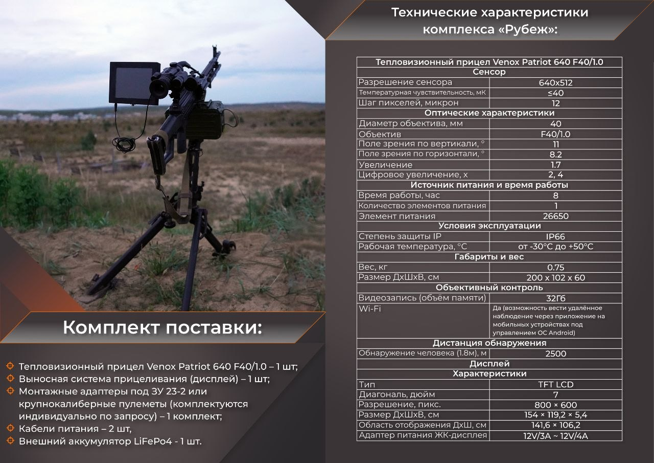 Тепловизионный прицельный комплекс «Рубеж» — это современное средство наблюдения и прицеливания для мобильных огневых групп, обеспечивающее уверенное обнаружение и сопровождение БПЛА самолетного типа в сложных условиях видимости, включая ночь, туман, дым и осадки. Комплекс повышает точность наведения, сокращает время реакции и помогает эффективно работать по БПЛА на различных дистанциях.